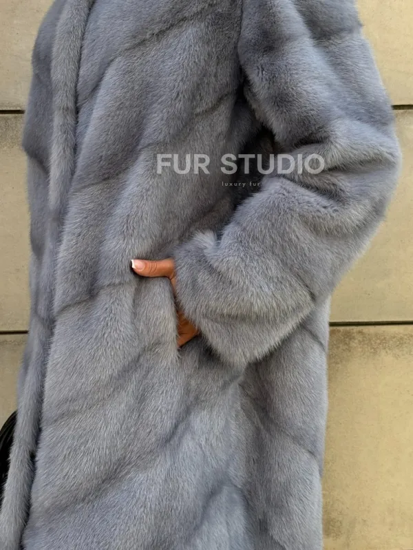 Мех данной шубы аукционная норка, цвет голубой. Предлагается в размерах от 42 до 50. Длина модели 95-100 см, что выгодно подчеркивает фигуру девушек. Эта модель идеально подойдет для девушек и женщин, предпочитающих роскошные натуральные меха.
